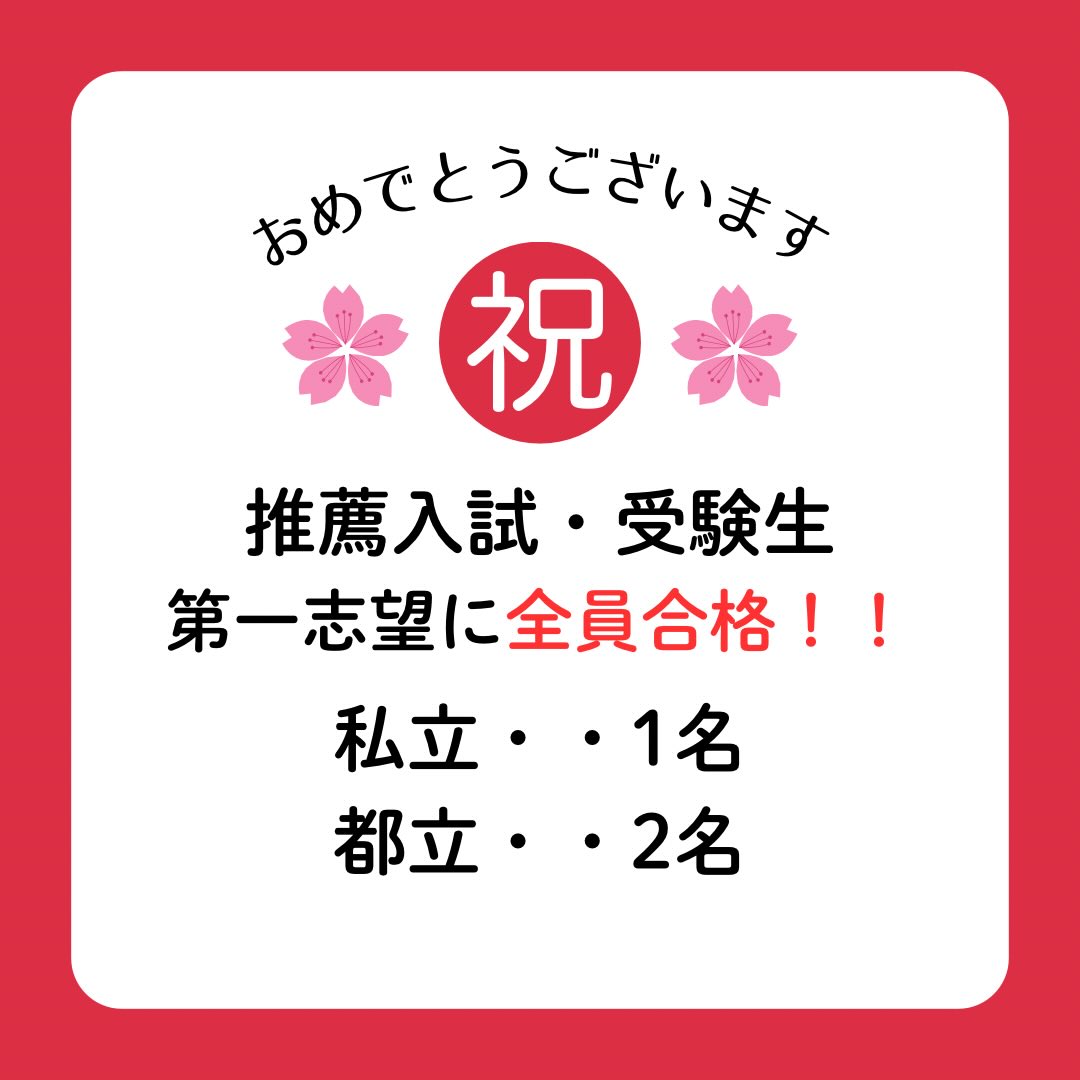 【推薦入試・全員合格!!🌸】 本日、都立高校推薦入試の合格発表があり、当塾の受験生2名が無事に合格を掴み取りました👏 今年度は推薦入試での第一志望合格率100%でした😊 東京科学技術大学附属科学技術高校🈴 東京都立深沢高校🈴 東京都立町田総合高校🈴 #千歳船橋  #経堂  #桜丘中学校 #学習塾  #受験生応援