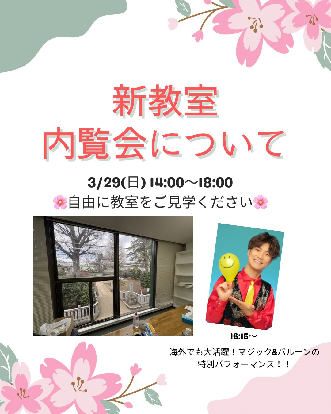 【新教室・内覧会のご案内🌸】 <日時> 3/29(日) 14時~18時(時間中はいつでもお越し頂けます。) <イベント> 16時〜 ご挨拶「これから目指していきたいこと」(塾長・野田) 16時15分〜 コメディパフォーマー『ハッピーつつい』による スペシャルパフォーマンス✨ 生徒の皆さん、保護者様、地域の皆様と一緒に、新しい教室・より良い学習環境をつくり上げ、新年度を迎えられるように努力して参ります。 どうぞ引き続きよろしくお願いいたします。 塾長・野田 #経堂 #千歳船橋 #新規オープン #世田谷区  #学習塾